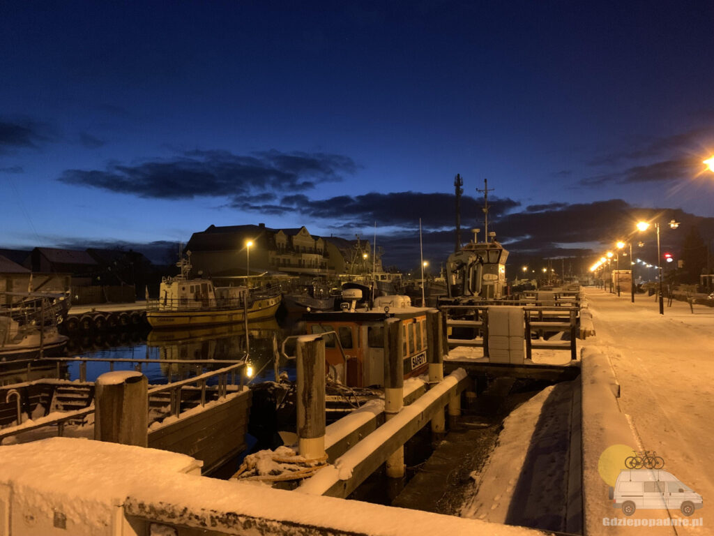 No jest tu ładniej niż we Władysławowie, nie da się ukryć. Zaryzykowałbym że w porze zimowej jest tu może nawet ciekawiej niż latem? Pod warunkiem że jest śnieg oczywiście. Port rybacki wygląda obłędnie, zwłaszcza wieczorem. Śnieg, lód, łodzie rybackie i delikatne ciepłe światło latarni motywują do robienia zdjęć. Mimo że ręce marzną. W Łebie w odróżnieniu od Dębek, a nawet Władysławowa wybór restauracji jest większy. Latem nie przeszkadza nam żeby chwycić rękę jakąś bułę czy zrobić coś samemu, ale zimą trzeba się ogrzać. Zwłaszcza że musimy zadbać też o komfort naszego pupila, który ku naszemu zdziwieniu i tak ochoczo zwiedza niuchając wszystko co się da. Co do restauracji i pieska, nie było problemu żeby wejść z Dori do środka, co więcej Dori nie była tam jednym psiakiem. Na obiad trafiliśmy do “Tam gdzie zawsze” i znowu udało nam się trafić dobrze. Szczerze polecamy, a zwłaszcza Filet z dorsza Royal Greenland… Co za sos!