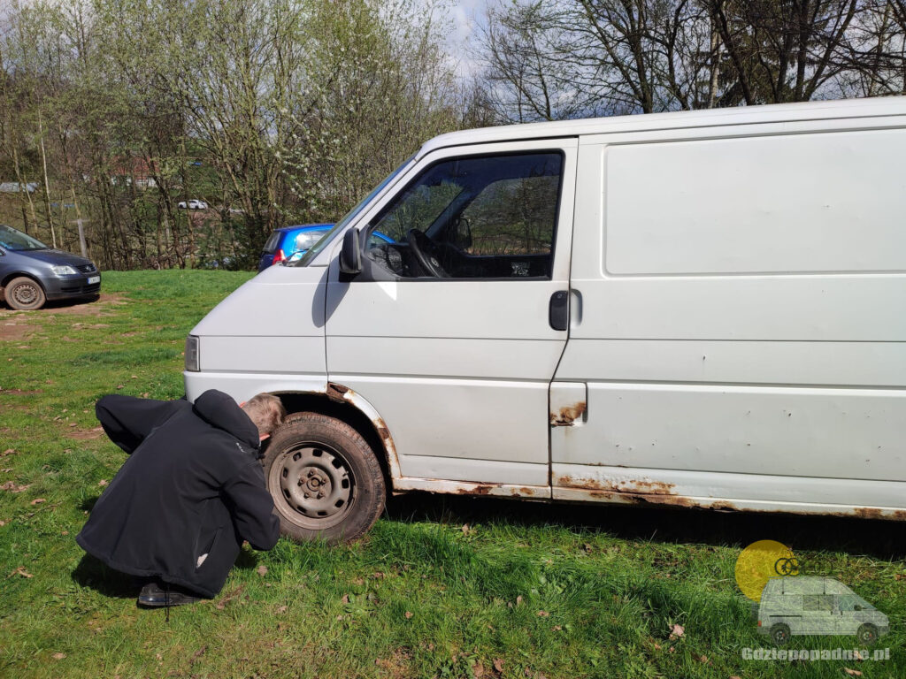 Oczywiście, rdza jest… Trudno, żeby w T4 jej nie było – ale bez tragedii. Dwie dziury w przednich nadkolach, każda mniej więcej 5×5 cm (jedna w podłodze) i trochę powierzchownego nalotu w kilku miejscach. To wszystko jednak, to nic poważnego i zdecydowanie do ogarnięcia. Szczegóły tego tematu omówimy później, ale jak na ten model, stan blachy naprawdę cieszy.